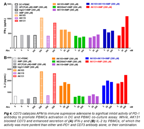CD73催化底物AMP生成的腺苷具有免疫抑制效应,当腺苷水平升高时,PD-1抗体的免疫激活效应被削弱。细胞试验显示,CD73的水解底物AMP生成的腺苷存在的情况下,PD-1抗体诱导免疫细胞激活,分泌IL-2等细胞因子的活性显著地被削弱,而由于AK131可同时抑制CD73和PD-1通路,因此其较PD-1单抗单药,以及PD-1和CD73单抗联合用药展示了更强的免疫激活药效,诱导了更强的IFN-γ和IL-2的分泌。