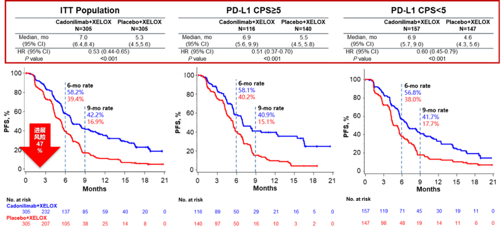 可以看到,COMPASSION-15研究中卡度尼利单抗联合化疗组入组了较高比例的预后较差的患者,包括≥65岁、ECOG PS 1、原发肿瘤位置为胃食管结合部、肝转移、CPS<1、CPS<5的患者,但仍然获得了亮眼的一线治疗生存获益。COMPASSION-15研究中针对PS=1的患者,OS HR=0.60,降低了40%的疾病死亡风险,令人振奋;针对原发灶位置为胃食管结合部的患者OS HR=0.59,针对肝转移患者的OS HR=0.50,实属不易。此外,卡度尼利单抗联合化疗组在PD-L1高表达或低表达患者中均显著获益,可大幅降低疾病进展或死亡风险,具有高肿瘤缓解效力,而且不良反应谱保持一致,未发生特殊不良反应。