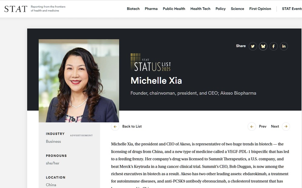 日前,国际著名生物医药行业媒体《STAT》隆重发布了其年度重磅评选“The 2025 STATUS List”(2025年全球领军人物榜单),该榜单从全球医疗政界、生物技术、卫生技术、医学和卫生保健等领域,遴选了对塑造健康与生命科学未来全球最具有影响力的50位领军人物。