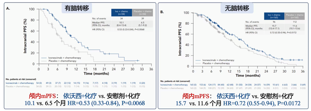 HARMONi研究共纳入438例三代EGFR-TKI进展后的EGFR突变NSCLC患者,其中基线伴脑转移者108例(每组各54例)。ELCC公布的结果显示[1],依沃西治疗组在基线伴有脑转移人群的颅内mPFS达到10.1个月,而对照组为6.5 个月,HR=0.53 (0.33-0.84), P=0.0068。在基线无脑转移人群中,依沃西治疗组的中位颅内PFS达15.7个月,也显著优于对照组的11.6个月,HR=0.72(0.55-0.94)。