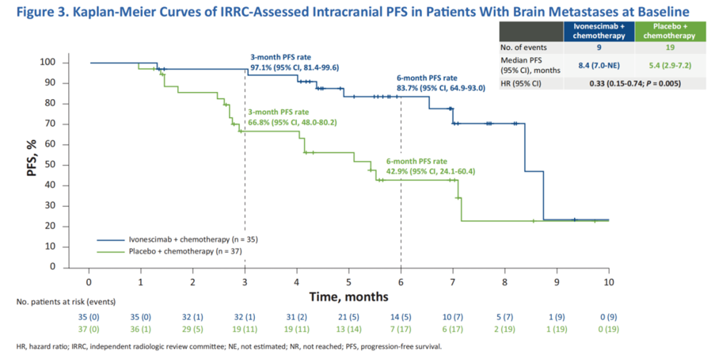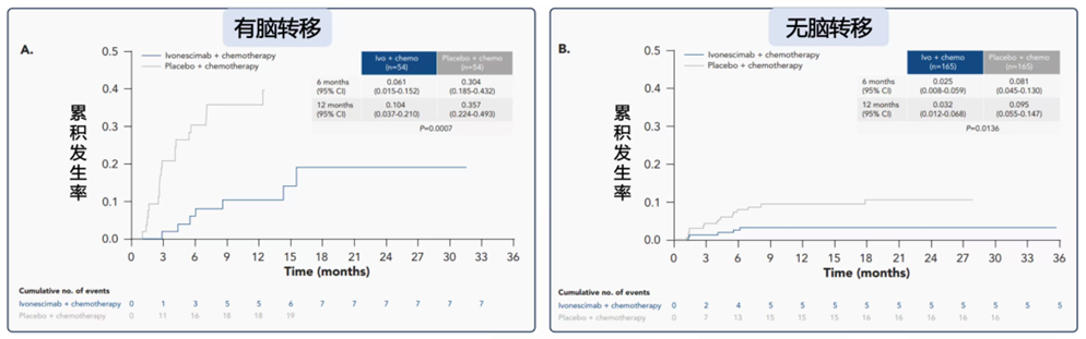更令人惊喜的是,依沃西治疗组在6个月和12个月的脑转移累积发生率均显著低于对照组。在基线伴脑转移人群中,依沃西联合化疗组6个月和12个月的颅内进展累积发生率分别为6.1%和10.4%,而对照组则高达30.4%和35.7%(P=0.0007)。在基线无脑转移人群中,依沃西组的6个月和12个月的脑转移累积发生率分别仅为2.5%和3.2%,对照组则为8.1%和9.5%(P=0.0136)[1]。这说明对于基线无脑转移的患者接受依沃西联合化疗治疗的脑转移累积发生率比对照组减少了2/3,在依沃西治疗1年时,仅有3.2%患者发生脑转移。这种差异充分说明了依沃西在治疗和预防脑转移上的优势,依沃西可能具有“脑保护”的作用机制以降低脑转移的风险。