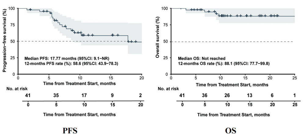 在生存获益方面,中位无进展生存期(PFS)为17.77个月,12个月PFS率为58.6%;总生存期(OS)数据尚未成熟,但12个月OS率已达到88.1%,提示了良好的生存趋势。