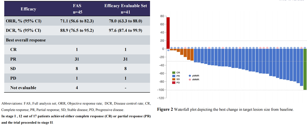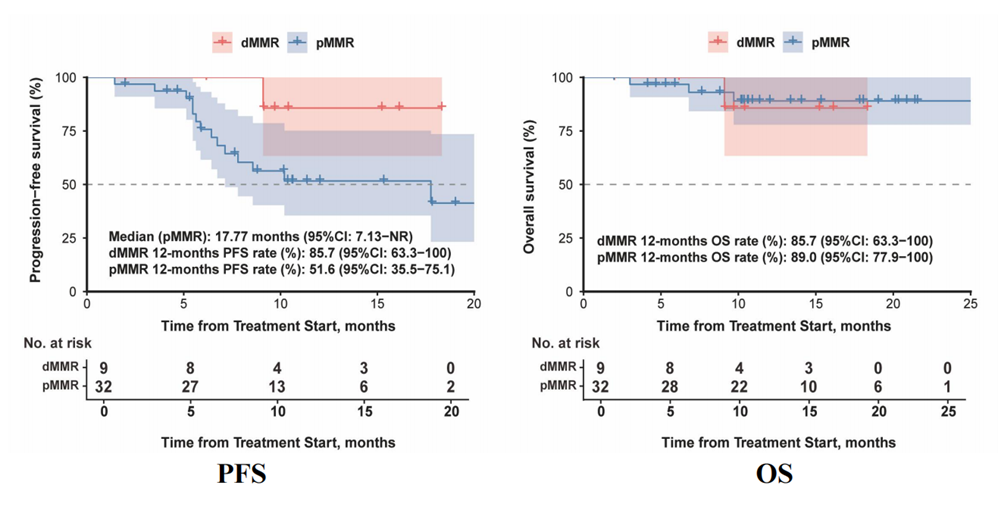 特别值得关注的是亚组分析结果:无论患者的错配修复功能状态如何,均观察到了临床获益,其中错配修复功能缺陷(dMMR)患者12个月PFS率为85.7%,而功能完整(pMMR)患者也达到了51.6%;OS获益方面,dMMR患者12个月OS率为85.7%,而pMMR患者达到了89.0%[1]。