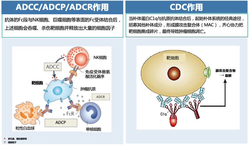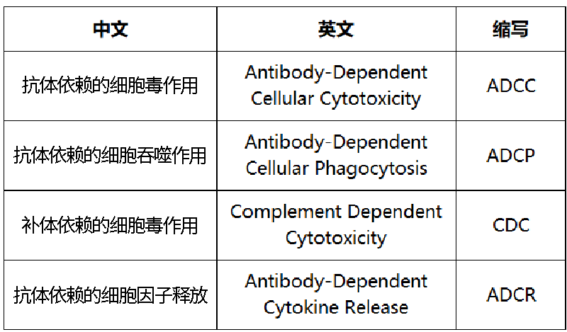 其中 Fc 段可以与一些免疫细胞上的 Fc 受体结合,引发诸如 ADCC、ADCP 和 ADCR 等效应;还可以与补体系统 C1q 蛋白结合,引发 CDC 效应。由于这些细胞效应主要来自抗体的 Fc 段与免疫系统其他成分的结合,也被称为抗体的 Fc 效应,具体见表4。