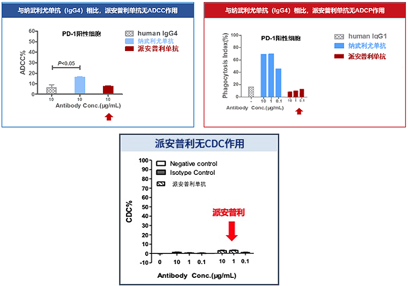 派安普利单抗是目前唯一采用 IgG1 亚型并进行 Fc 段改造的新型 PD-1 单抗,在重链Fc端利用基因工程技术进行氨基酸突变,形成Fc silencing,消除与Fc受体结合的能力。从结果来看,这样的改造一方面完全去除 ADCC/ADCP/CDC 效应,显著减少效应 T 细胞耗损。