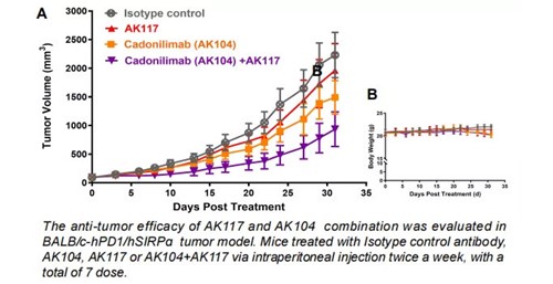 AK117单药使用具有良好的抗肿瘤活性和安全性,与免疫检查点抑制剂,如PD1/CTLA4双特异性抗体卡度尼利单抗 (AK104)的联合治疗具有协同抗肿瘤作用。
