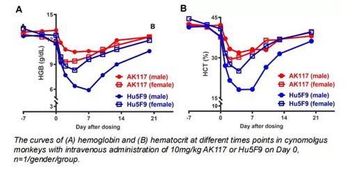 AK117对食蟹猴贫血发生的影响很小,仅出现轻微的红细胞变化;