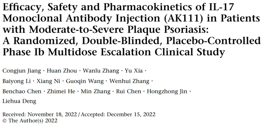 IL-17A是一种促炎因子,在银屑病的发病机制中起着关键作用。体育博彩自主研发的AK111是一种靶向IL-17A的人源化IgG1单克隆抗体,可高亲和力特异性结合IL-17A,阻断其与T细胞、自然杀伤细胞和抗原呈递细胞表面表达的IL-17受体A(IL-17RA)结合,从而阻断其下游细胞免疫应答。与已上市的IL-17抗体相比,AK111在抗原结合试验、细胞学试验和动物模型中表现出相似的活性和安全性。在新西兰完成了健康受试者AK111的Ⅰ期试验验证了AK111的良好的安全性和耐受性。本次发布于Dermatology and Therapy的Ⅰb期多剂量递增临床研究达到临床主要和次要终点,AK111在中、重度斑块状银屑病中表现出良好的安全性、耐受性和有效性,为进一步验证AK111的临床疗效提供了基础。