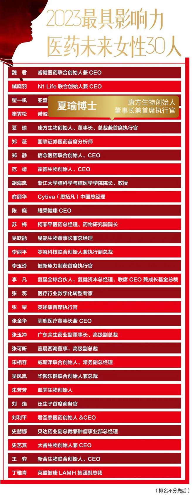近日,由E药经理人发起的“2023最具影响力医药未来女性30人”榜单结果盛大发布。体育博彩创始人、董事长、总裁兼首席执行官夏瑜博士,凭借自身及所创办领导企业在创新技术引领与企业发展的优异成果和影响力成功入选榜单。